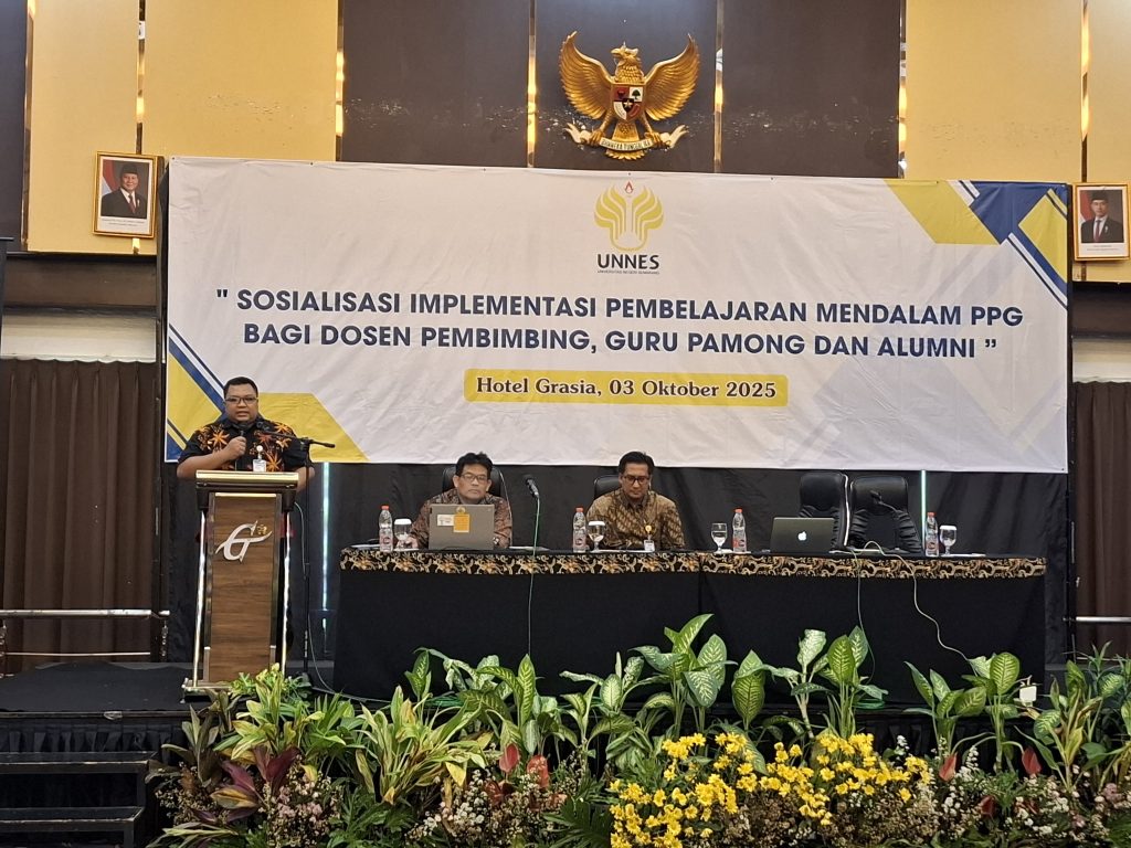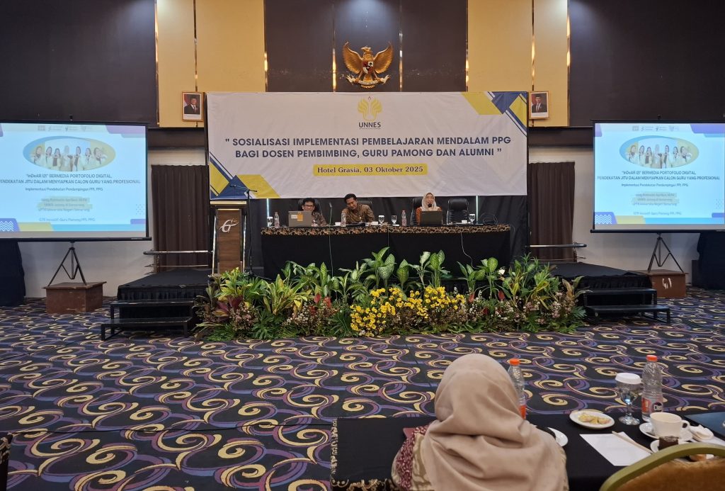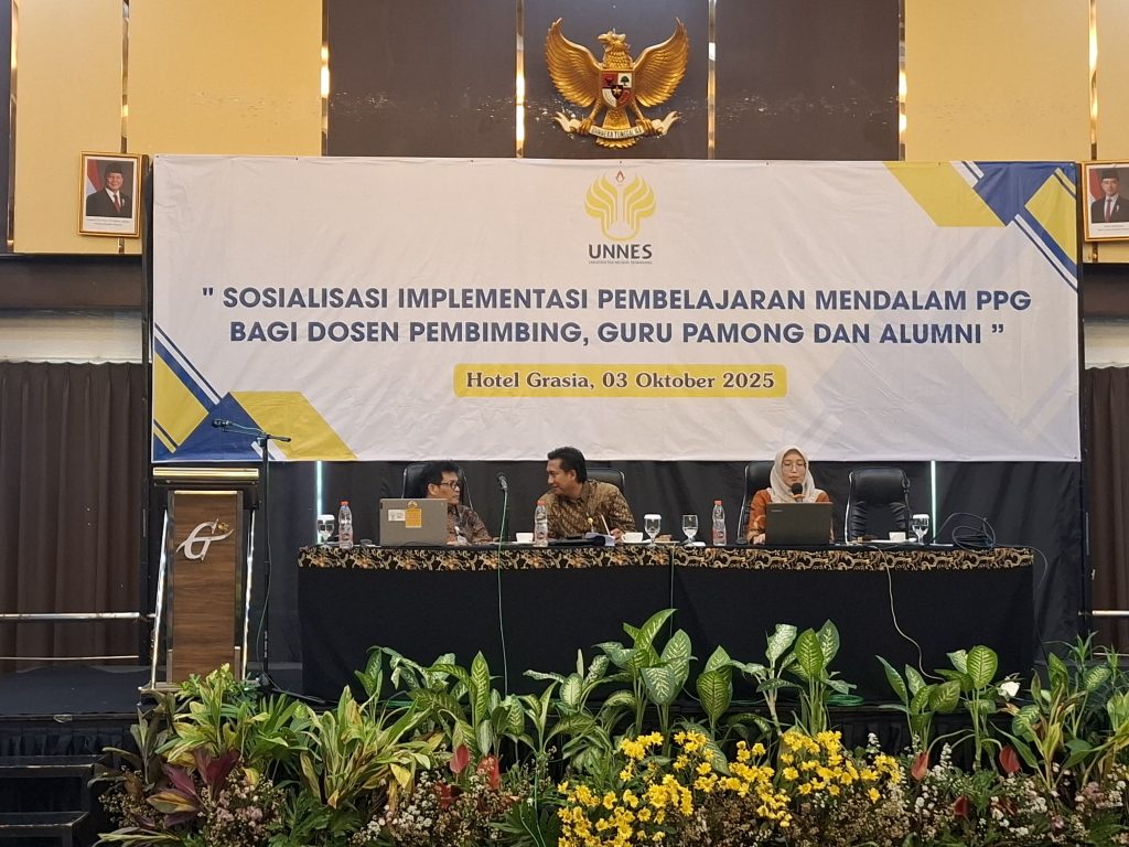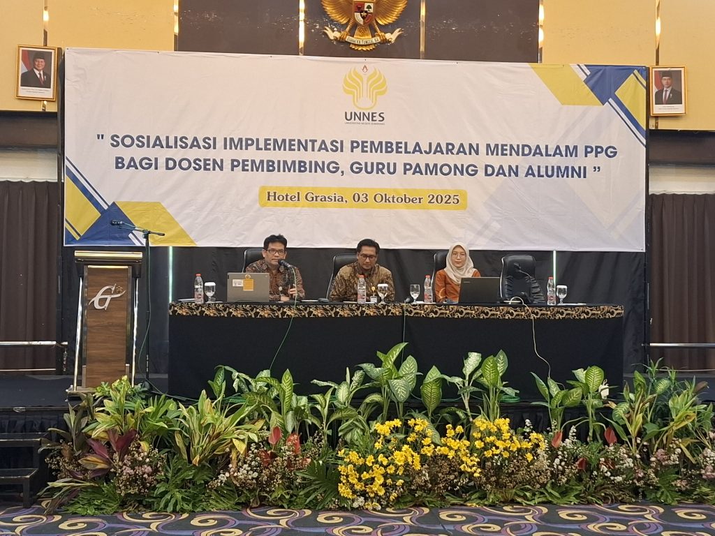 Semarang – Program Pendidikan Profesi Guru (PPG) Universitas Negeri Semarang (UNNES) menggelar kegiatan sosialisasi Pembelajaran Mendalam pada Jumat, 3 Oktober 2025 di Hotel Grasia, Semarang. Kegiatan ini diikuti lebih dari 200 peserta yang terdiri atas guru pamong, dosen pembimbing, dan alumni PPG UNNES. Acara ini menjadi bentuk komitmen UNNES dalam memastikan kualitas penyelenggaraan PPG sekaligus memperkuat kompetensi para pendidik dalam mengimplementasikan pembelajaran yang relevan dengan tuntutan zaman.