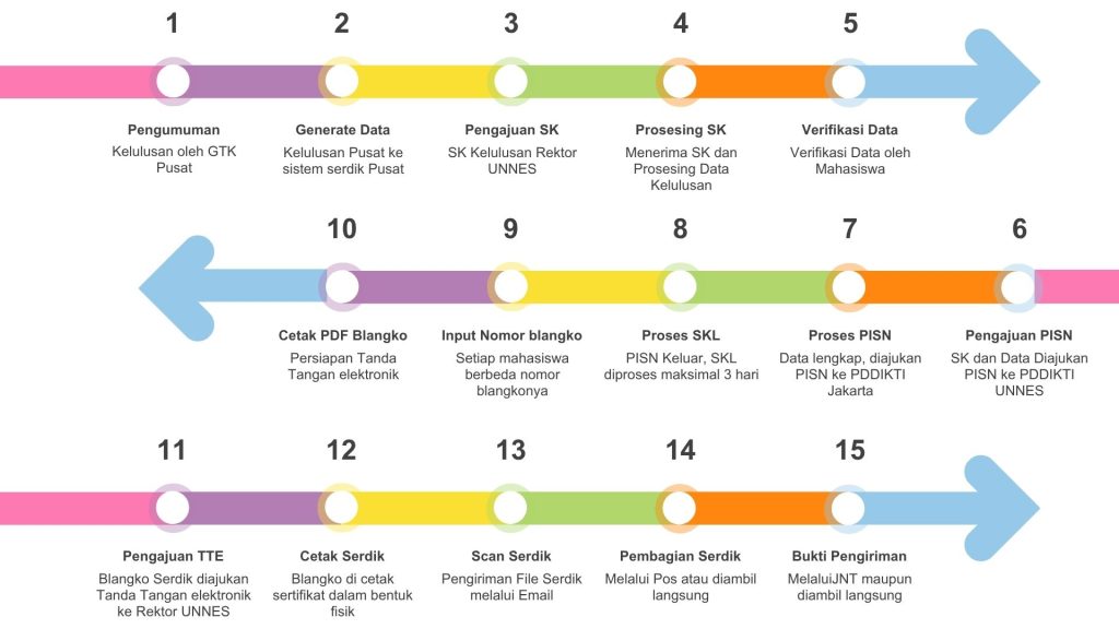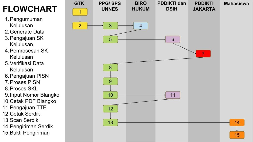 Pemrosesan Data Kelulusan Mahasiswa PPG Universitas Negeri Semarang sampai dengan Sertifikat Pendidik di tangan Peserta PPG, memerlukan 15 tahap sebagai berikut: