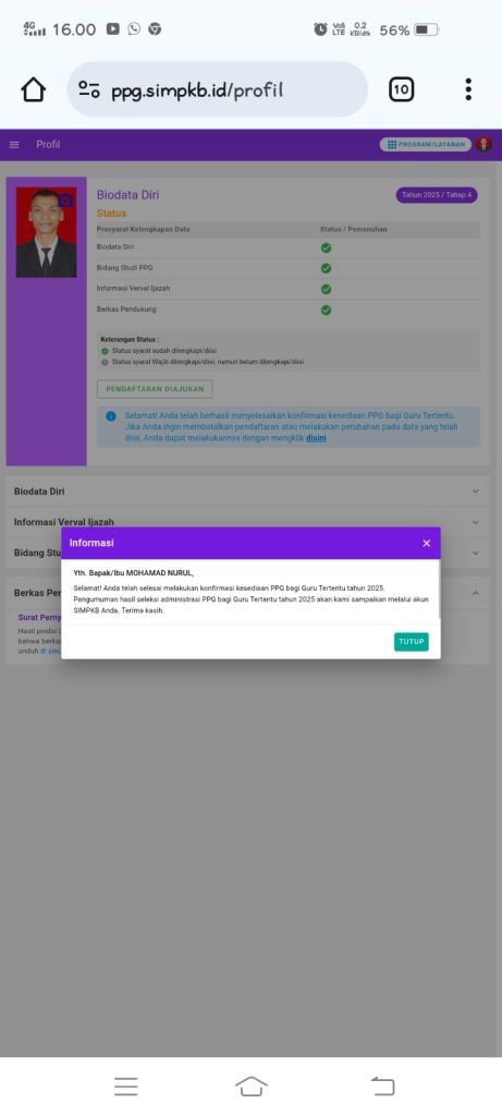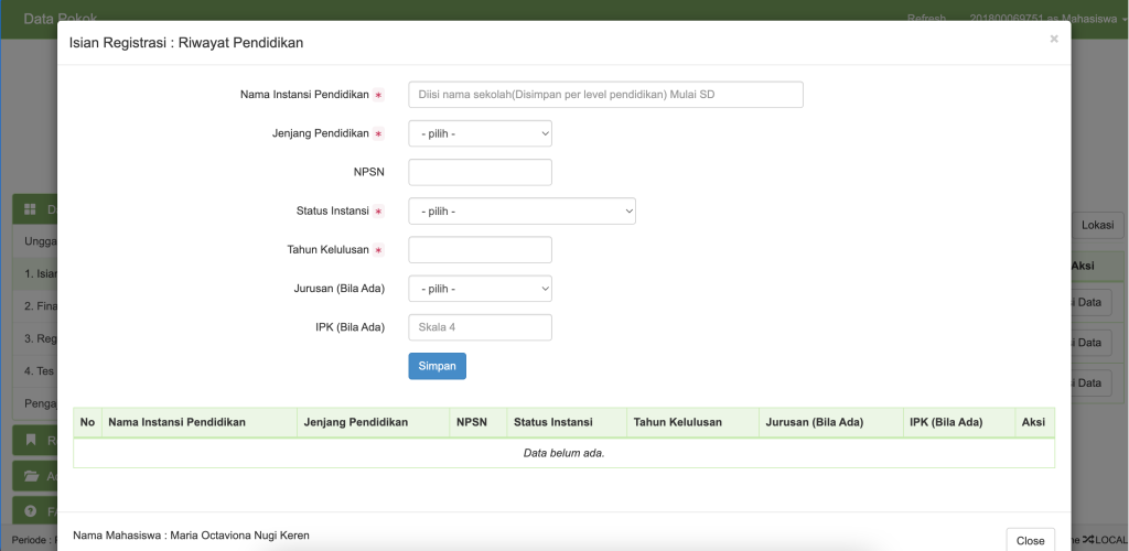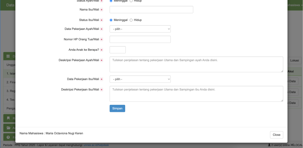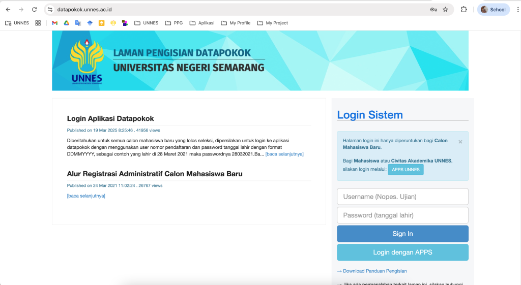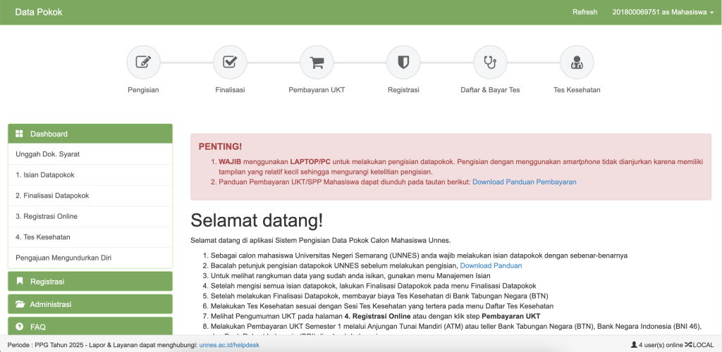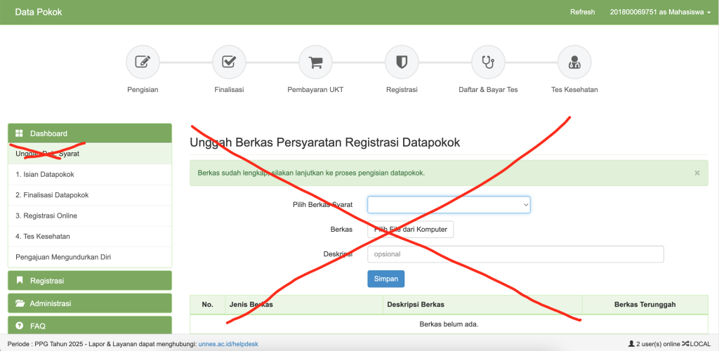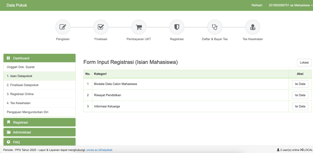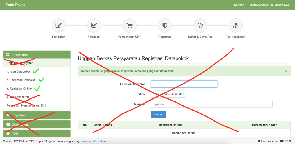 A: BELUM. Anda belum Lapor diri di LPTK. di UNNES, lapor diri/ registrasi melalui laman datapokok.unnes.ac.id. Panduannya ada di bagian berikutnya.