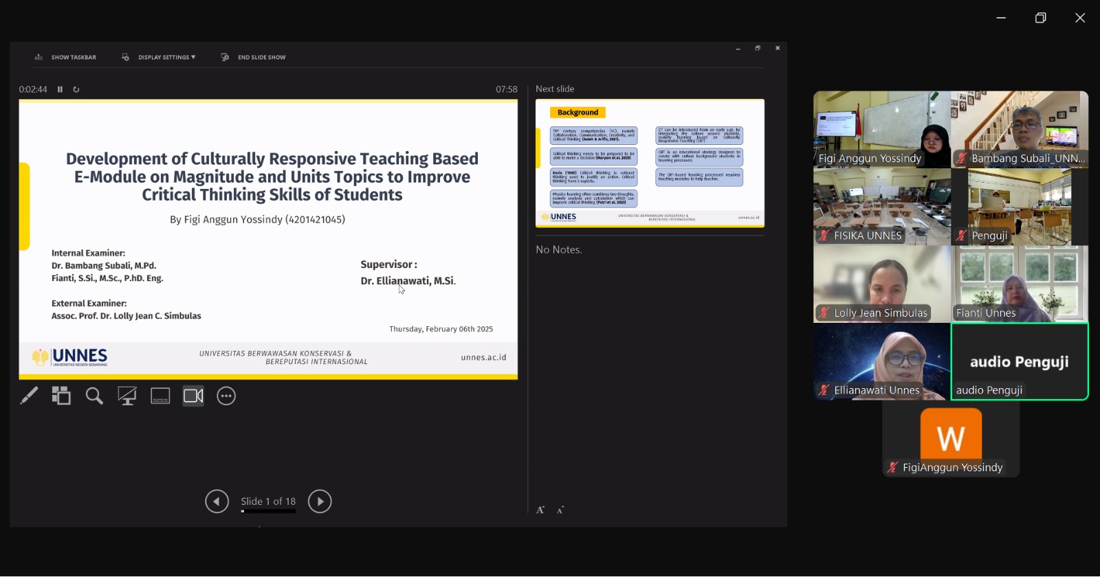 Semarang, October 2025 — A few months ago, on Thursday, February 6, 2025, Physics Education student Figi Anggun Yossindy successfully defended her undergraduate thesis before a panel of examiners consisting of Dr. Bambang Subali, M.Pd. and Fianti, S.Si., M.Sc., Ph.D. Eng. as internal examiners, and Dr. Lolly Jean C. Simbulas from the University of the...