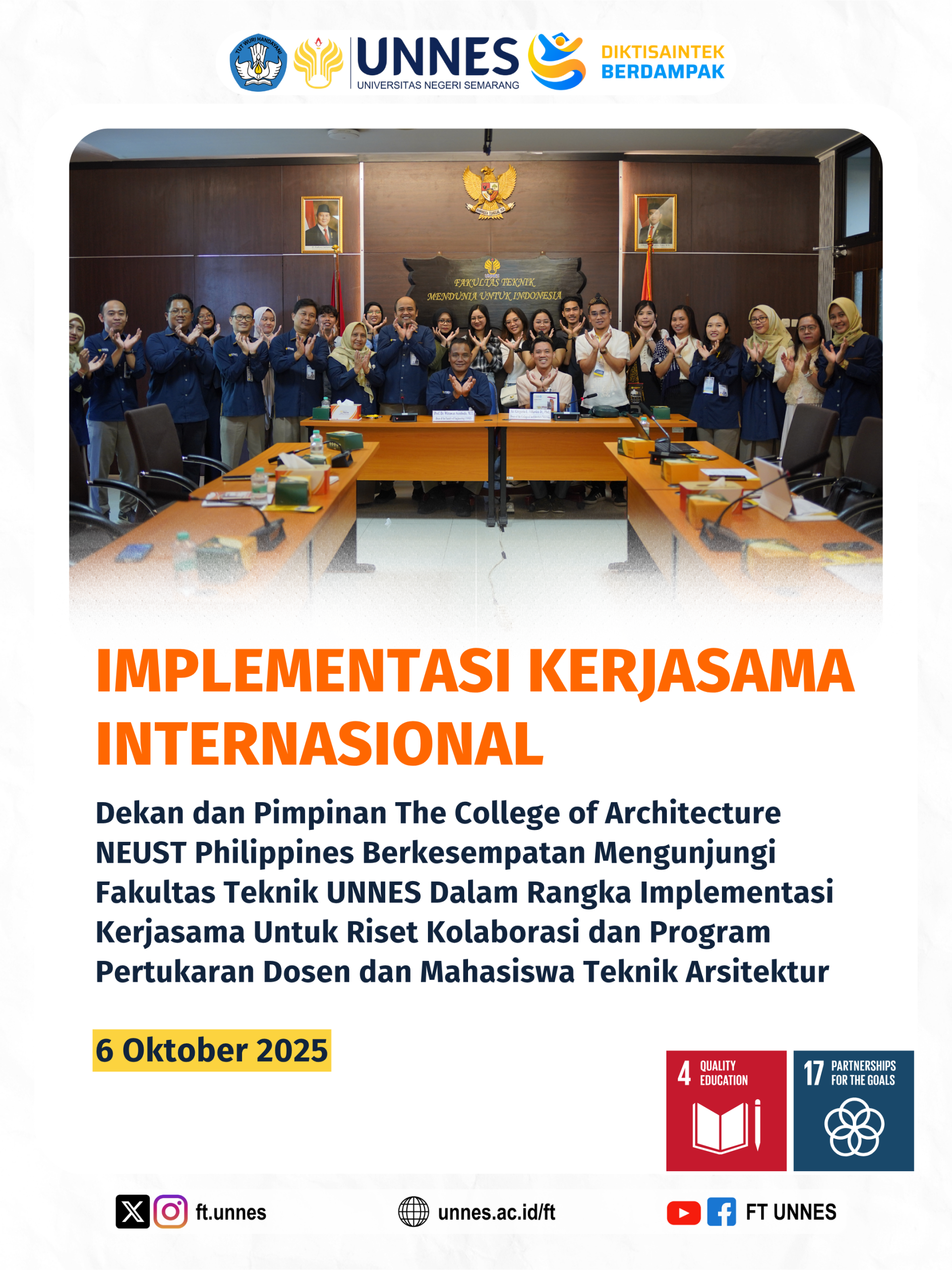 The College of Architecture, Nueva Ecija University of Science and Technology (NEUST), Philippines, visited Faculty of Engineering, University of Ness on October 6, 2025, at UNNES. This visit was a reciprocal visit for the collaborative research and lecture exchange program that took place from September 1 to 5, 2025. The collaborative research and lecture exchange...
