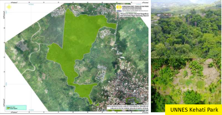 A central highlight of UNNES’s open space system is the UNNES Kehati Park (Kawasan Keanekaragaman Hayati), which covers an expansive 695,935.80 m². This biodiversity park, located in Gunung Ledek, Sukorejo, serves as a living laboratory for conservation education and ecological research. Complementing this, the Forest Area with the Special Purpose of Forestry Education and Training (KHDTK) in Kendal Regency covers 684,200 m² (68.42 ha), designated under the Ministry of Environment and Forestry Decree No. 1134 of 2024. This area supports forestry education, biodiversity preservation, and practical training for environmental students.