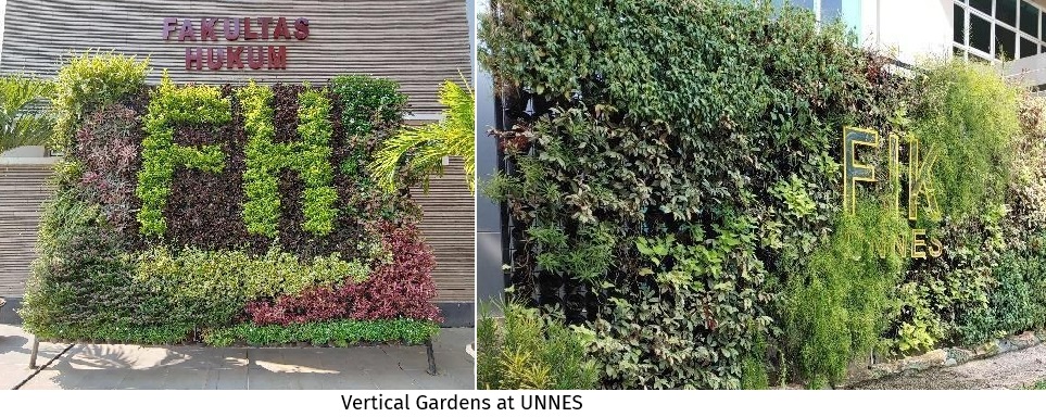 In addition to passive design strategies, UNNES incorporates green landscape integration through indoor and outdoor vertical gardens that improve thermal comfort and air quality within and around buildings. These green elements are present in key facilities. These vertical gardens play a crucial role in enhancing building aesthetics, regulating temperature, and contributing to the overall ecological balance of the campus environment.