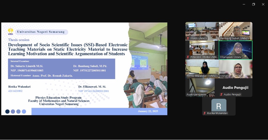 This morning, Wednesday, January 22, 2025, Physics Education Study Program student Ristika Wulandari defended her research results entitled Development of Digital Teaching Materials Based on Socio-Scientific Issues (SSI) on Static Electricity Material to Improve Students’ Learning Motivation and Scientific Argumentation in front of the panelists. Under the supervision of Dr. Ellianawati, M.Sc., Ristika conducted her research at SMA N 4 Semarang involving 130 grade XII students.