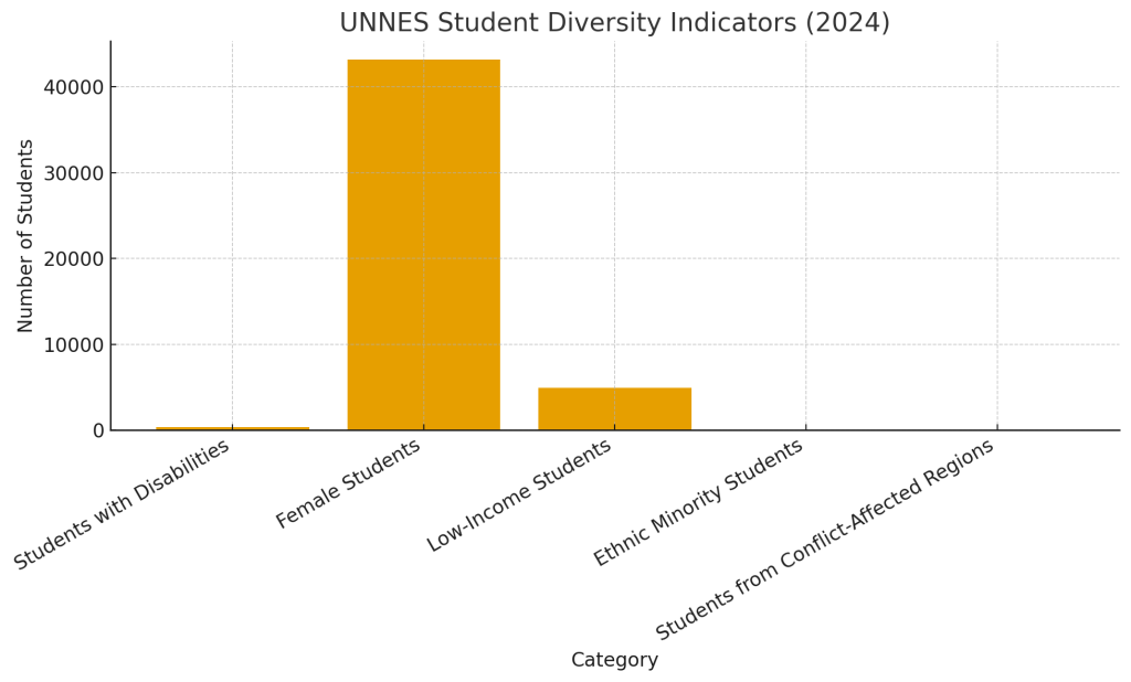 Universitas Negeri Semarang (UNNES) continues to demonstrate its dedication to equity, diversity, and inclusion by systematically measuring and tracking applications and admissions among underrepresented groups, including women, people with disabilities, low-income students, and students from diverse national and cultural backgrounds.