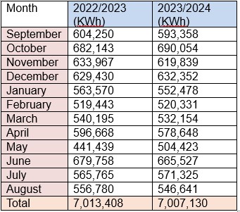 This figure shows a slight decrease compared to the 7,013,408 kWh recorded in the 2022/2023 period, reflecting consistent efforts to optimize energy use through conservation programs and efficient operational management.