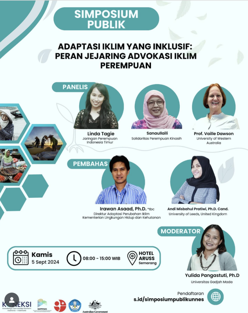 In the academic and policy research domain, UNNES expands its contribution to international climate cooperation through the Centre for Literacy Studies (FBS). From August 2023 to July 2024, the Center leads a joint research project titled “Inclusive Climate Adaptation: The Roles of Women’s Climate Advocacy Network”, in collaboration with Bappenas, Kemdikbudristek, BRIN, the Knowledge Partnership Platform (KONEKSI), and leading universities such as the Australian National University (ANU), University of Western Australia (UWA), and Universitas Gadjah Mada (UGM). Funded by the Australian Government’s Department of Foreign Affairs and Trade, the study focuses on women-led NGOs in Yogyakarta, Palu, and Kupang, examining their roles in inclusive climate adaptation, community advocacy, and environmental protection.