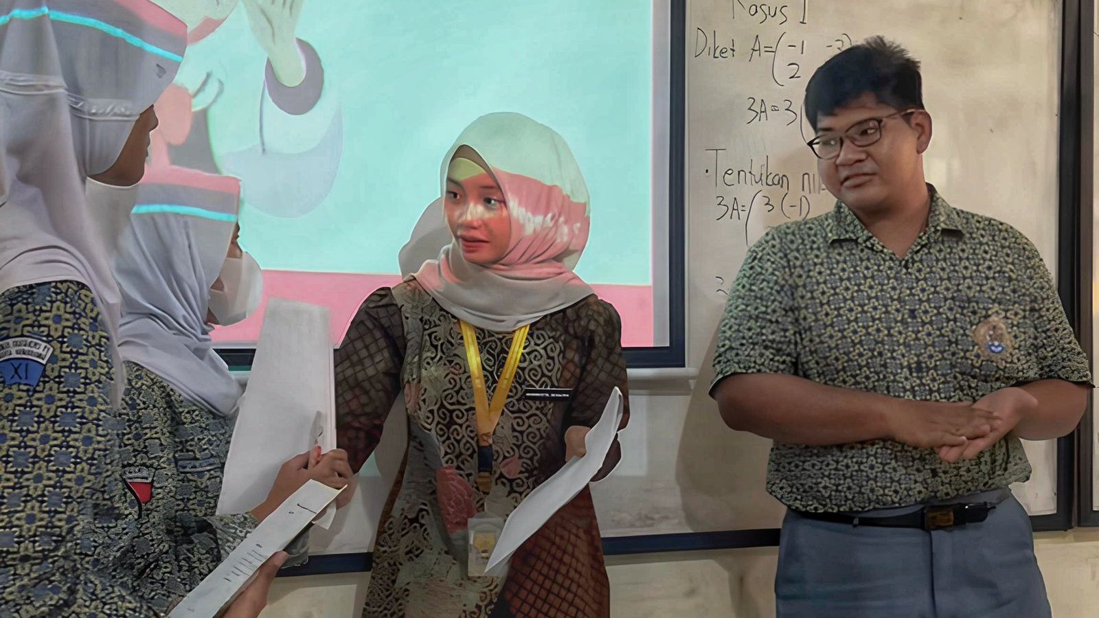 Mahasiswa Program Studi Pendidikan Matematika, Fakultas Matematika dan Ilmu Pengetahuan Alam (FMIPA) Universitas Negeri Semarang (UNNES), Zarimatul Khalwa, menerapkan pembelajaran kreatif melalui pendampingan penyelesaian Lembar Kerja Peserta Didik (LKPD) di SMAN 11 Semarang.